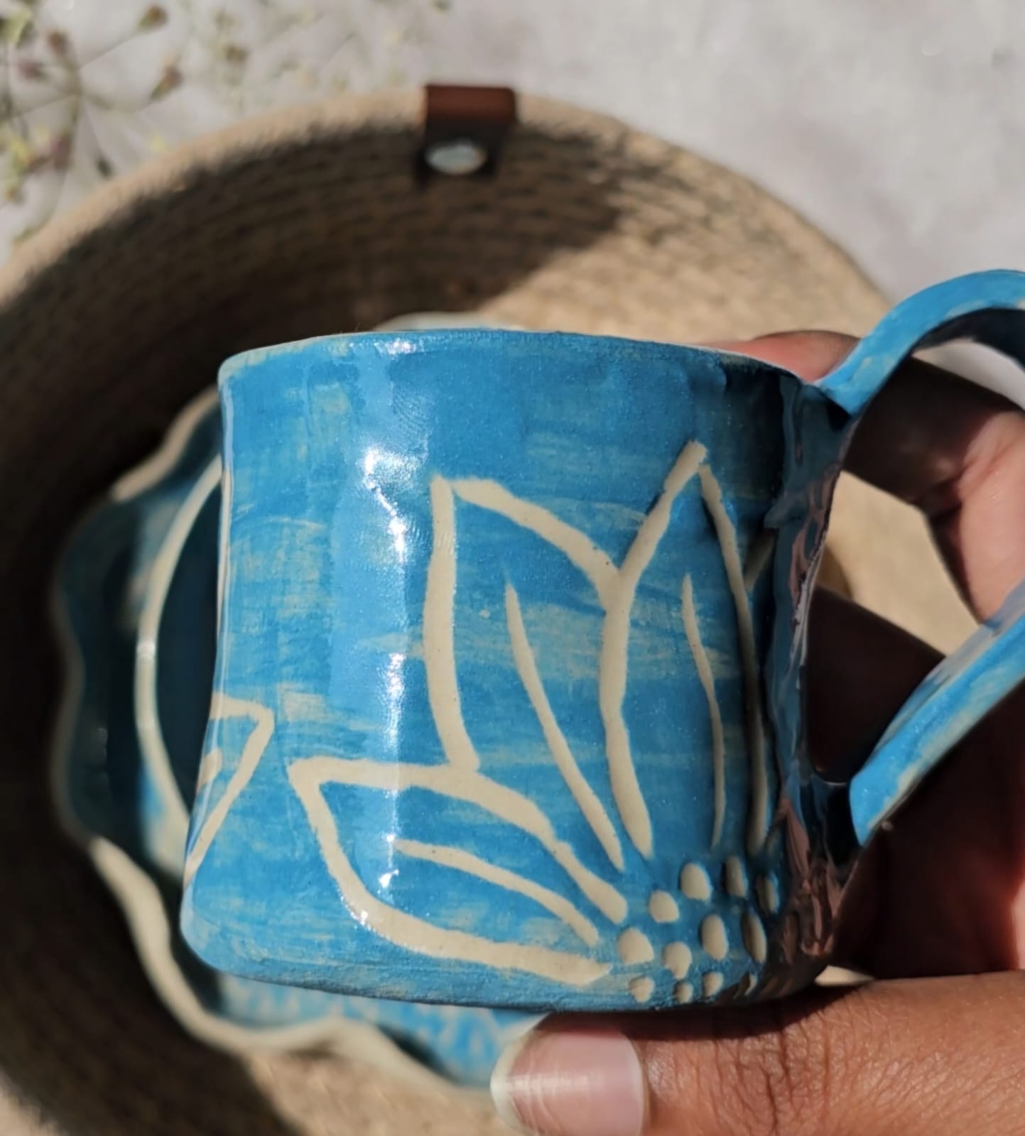Includes: 1Bread Plate, 1 Cup, 1 Bowl and a Jute Basket